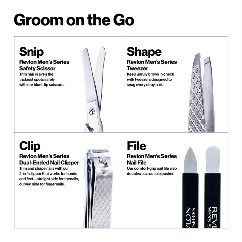 Revlon Men's Grooming Kit, Nail Clipper, Safety Grooming Scissors, Nail File & Tweezers, High Precision Hair Removal Tools, Stainless Steel (Pack of 1)