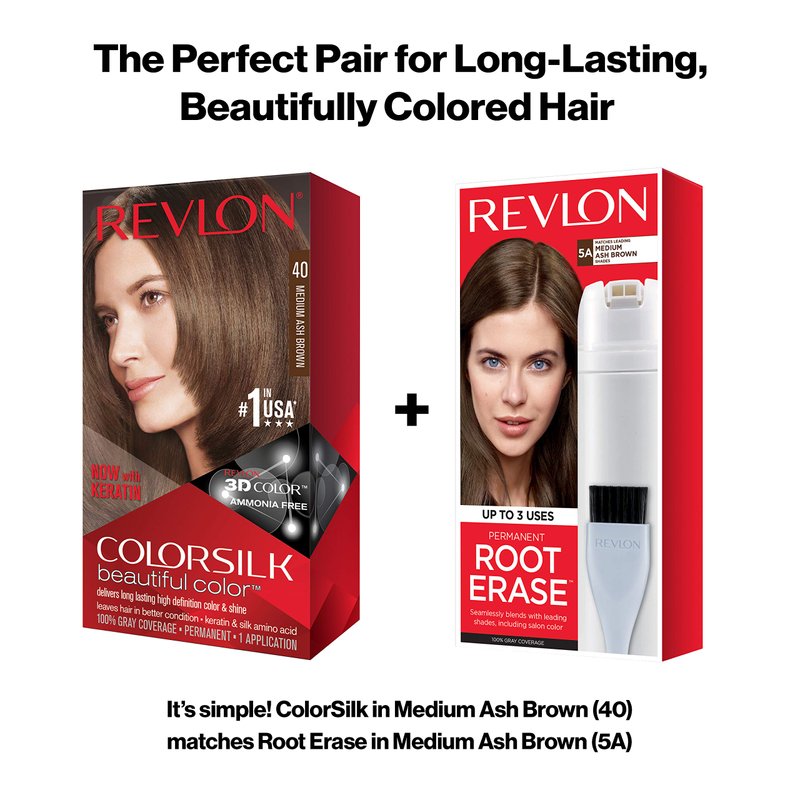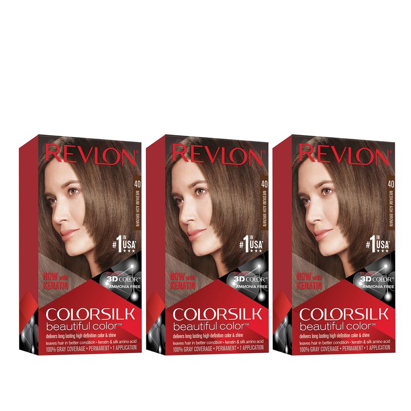 Revlon Permanent Hair Color, Permanent Hair Dye, Colorsilk with 100% Gray Coverage, Ammonia-Free, Keratin and Amino Acids, 40 Medium Ash Brown, 4.4 Oz (Pack of 3)