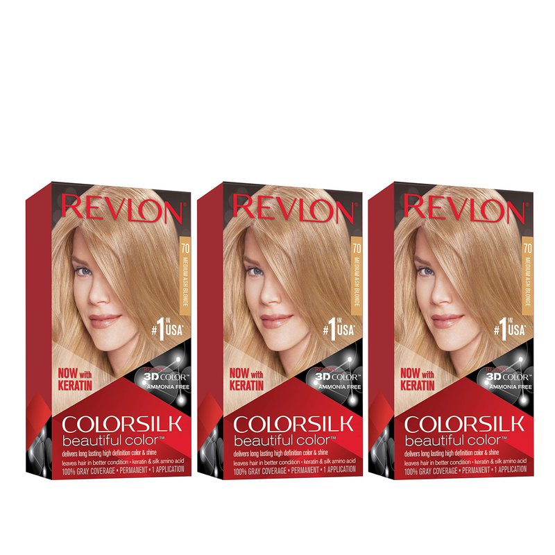 Revlon Permanent Hair Color, Permanent Hair Dye, Colorsilk with 100% Gray Coverage, Ammonia-Free, Keratin and Amino Acids, 70 Medium Ash Blonde, 4.4 Oz (Pack of 3)