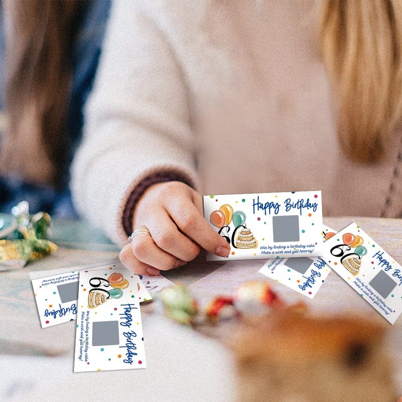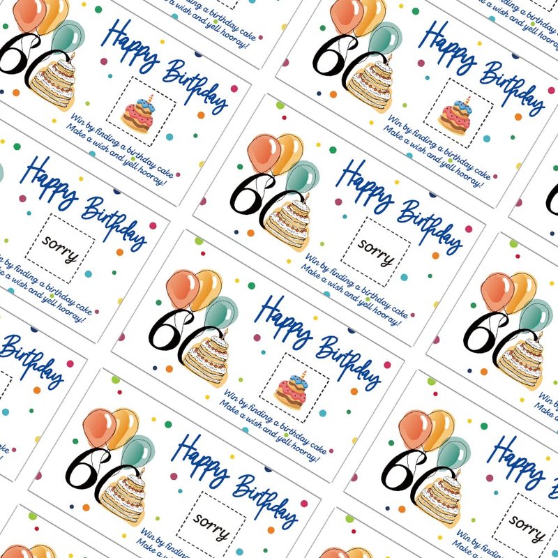 - Quick Party Fun:These scratch-off game cards are exquisite pattern design with 60th birthday elements. It can create a strong birthday atmosphere. We want to help you make your holiday party planning a breeze with quality scratch off games and party supplies for celebrating life,family,friendships and love. Add to cart for this year's merrymaking.