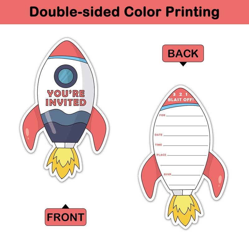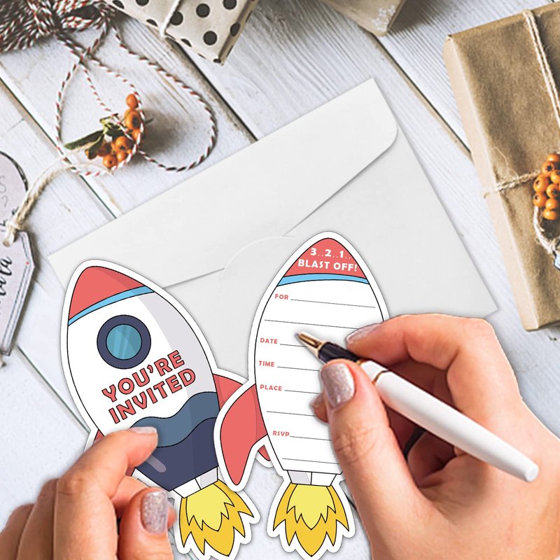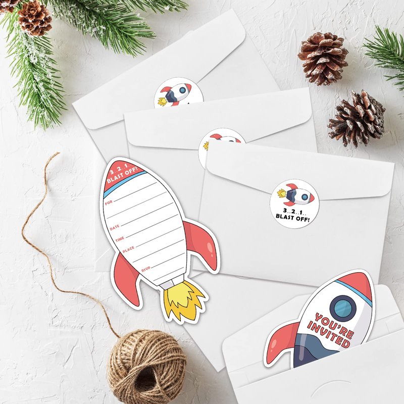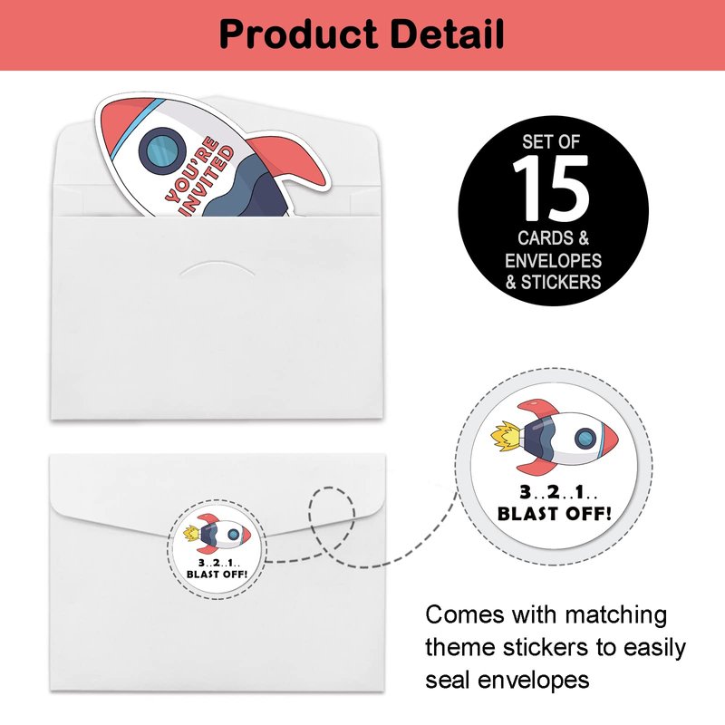 - Space Party Invitation Sets: There are 15 rocket ship shaped invitation cards, 15 premium white envelopes and 15 matching envelope seal stickers in this package. These beautiful invitations will make your party the talk of town and make the guests excited to come and participate.