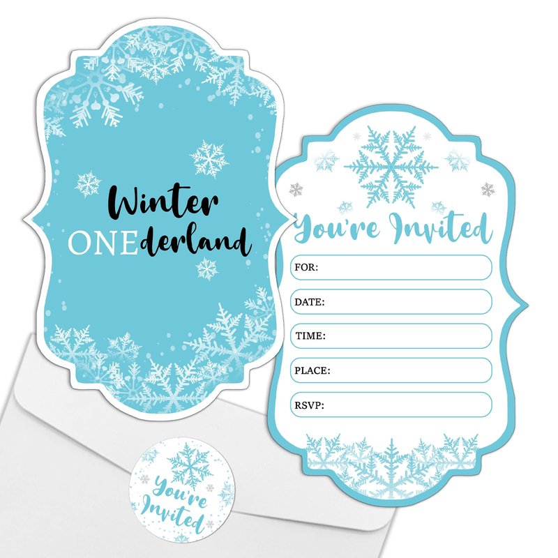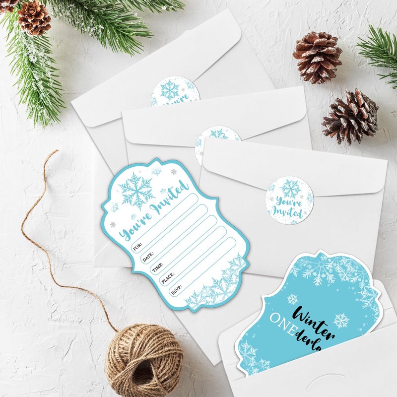 REWIDPARTY Winter Onederland Party Invitations with Envelopes & Stickers(Set of 15) Blue Snowflake Shaped Fill-in Invitations Boy 1st Birthday Party Invites Winter Wonderland Holiday Party Supplies