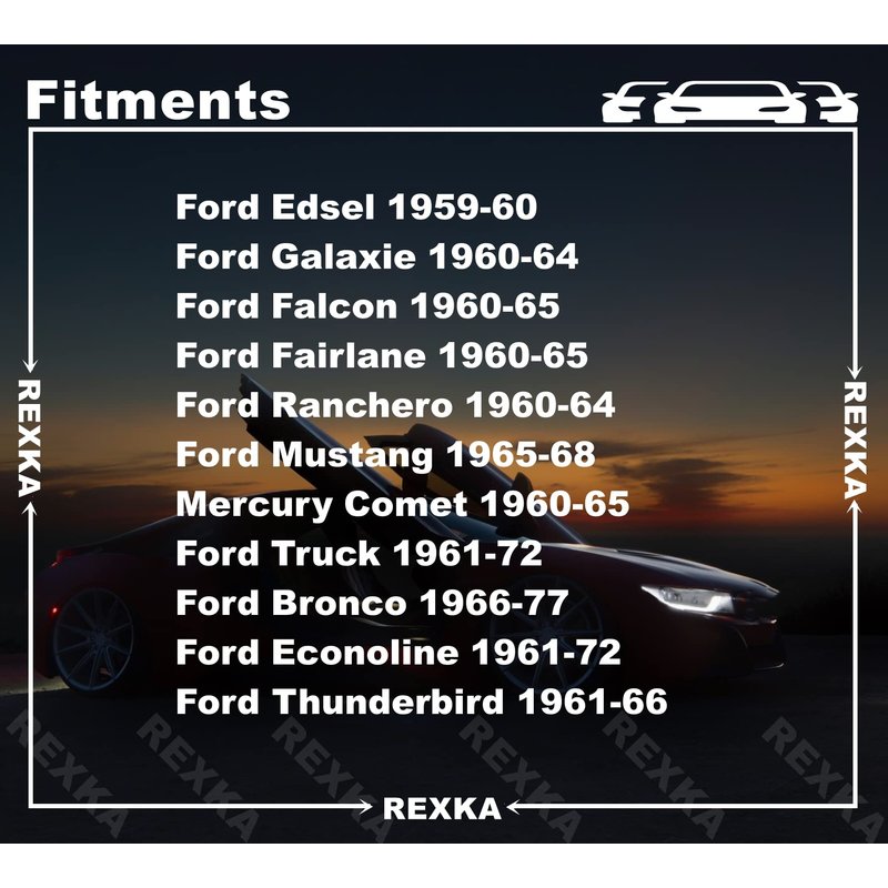 - Fit: Ford Falcon 1960-1965 Ford Fairlane 1960-1965 Mercury Comet 1960-1965 Ford Mustang 1965-1968 Ford Econoline 1961-1967 Ford Truck 1961-1972 Ford Bronco 1966-1977 Ford Thunderbird 1961-1966