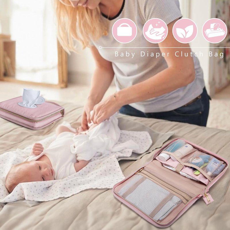 Rexmica Diaper Clutch Bag with 2 Pieces Wipes Dispensers, Small Diaper Bag with Multiple Pockets for Storage of Baby Necessities, Baby Travel Essential, Pink