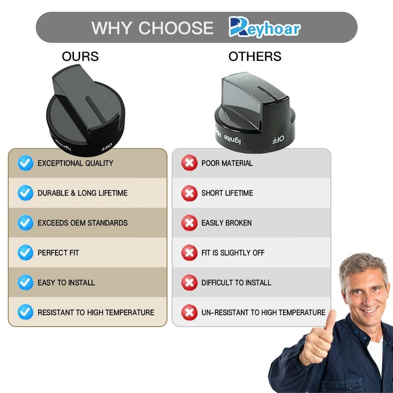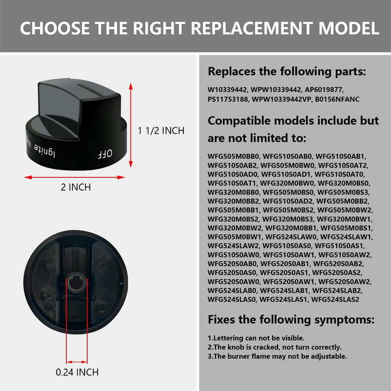 Reyhoar's Knob is sometimes known as a valve knob, works for a range, oven, or stove. This knob accepts a D-shaped shaft. No tools are required for completing this repair. A Range Top Surface Burner Knob, directly fit replacement for your worn, broken or missing knob. Replaces the following parts: W10339442, WPW10339442, AP6019877, PS11753188, WPW10339442VP, B0156NFANC Compatible models include but are not limited to: WFG320M0BB0, WFG320M0BS0, WFG320M0BW0, WFG505M0BB0, WFG505M0BS0, WFG505M0BW0, WFG510S0AB0, WFG510S0AB1, WFG510S0AB2, WFG510S0AD0, WFG510S0AD1, WFG510S0AD2, WFG510S0AS0, WFG510S0AS1, WFG510S0AS2, WFG510S0AT0, WFG510S0AT1, WFG510S0AT2, WFG510S0AW0, WFG510S0AW1, WFG510S0AW2, WFG520S0AB0, WFG520S0AB1, WFG520S0AB2, WFG520S0AS0, WFG520S0AS1, WFG520S0AS2, WFG520S0AW0, WFG520S0AW1, WFG520S0AW2, WFG524SLAB0, WFG524SLAB1, WFG524SLAB2, WFG524SLAS0, WFG524SLAS1, WFG524SLAS2, WFG524SLAW0, WFG524SLAW1, WFG524SLAW2, etc. Fixes the following symptoms: 1. Selection will not set; 2. Will not turn; 3. Will not stay on. Specifications: 1. Material: ABS plastic 2. Color: Black 3. Product Dimensions: 2.05"Φx 1.54"H (5.2 x 3.9cm) 4. Quantity: 4 Pcs