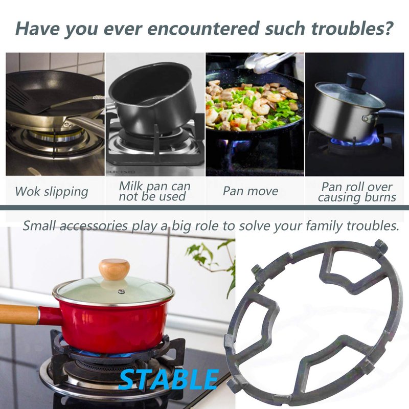 - 【Safe and Useful 】Iron wok pan support rack is ideal for balancing smaller pots or pans on the stovetop. A total of eight grooves on the bottom are suitable for various types of stove burner grates to stop slide. Eliminate dangerous cooking conditions and practice better kitchen safety.