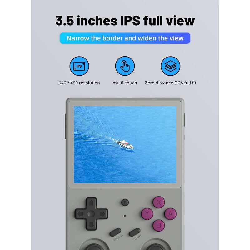 - The RG353VS handheld gaming console is designed with a sleek look, available in both black transparent and grey color options, and powered by a LINUX operating system. Equipped with a 3.5-inch IPS full viewing angle screen featuring zero distance OCA full fit at a resolution of 640*480, the console ensures an immersive gaming experience with sharp visuals.