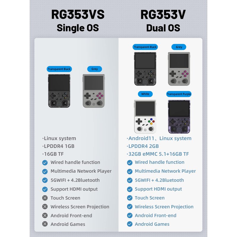 RG353V and RG353VS - two cutting-edge handheld gaming consoles designed to provide you with the ultimate gaming experience. Both models boast stylish color options, an array of advanced features, and compatibility with a wide range of game formats.