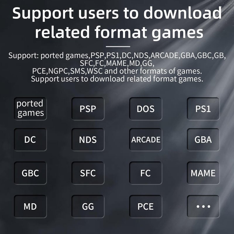 Games:"Support: ported games,PSP,PS1,DC,NDS,ARCADE,GBA,GBC,GB,SFC,FC,MAME,MD,GG,