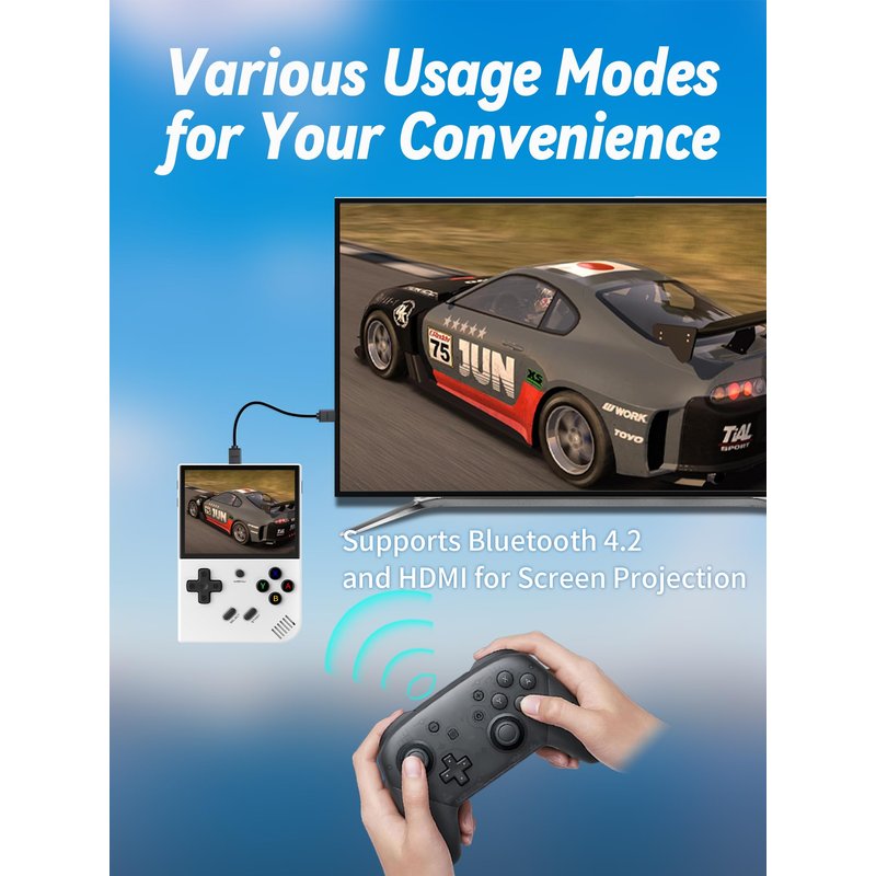 - [More Features] RG35XX Plus supports 2.4/5G WIFI, Bluetooth 4.2, 2.4G wireless and wired controller,.Bluetooth Handle Connection,H-D-M-I output TV, can connect console to the TV so that you can enjoy the funny and lively video game in bigger screen, also vibration motor, WIFI online pairing, streaming etc, and with the functions of saving. loading games, favorites and recent folders.