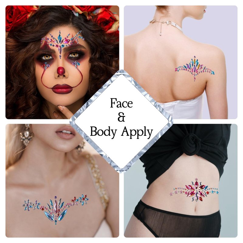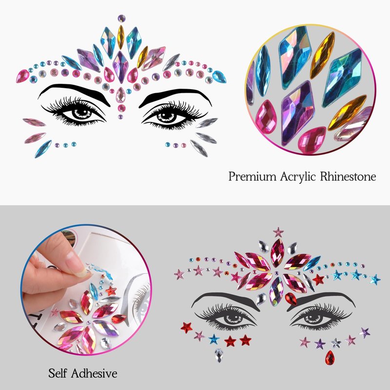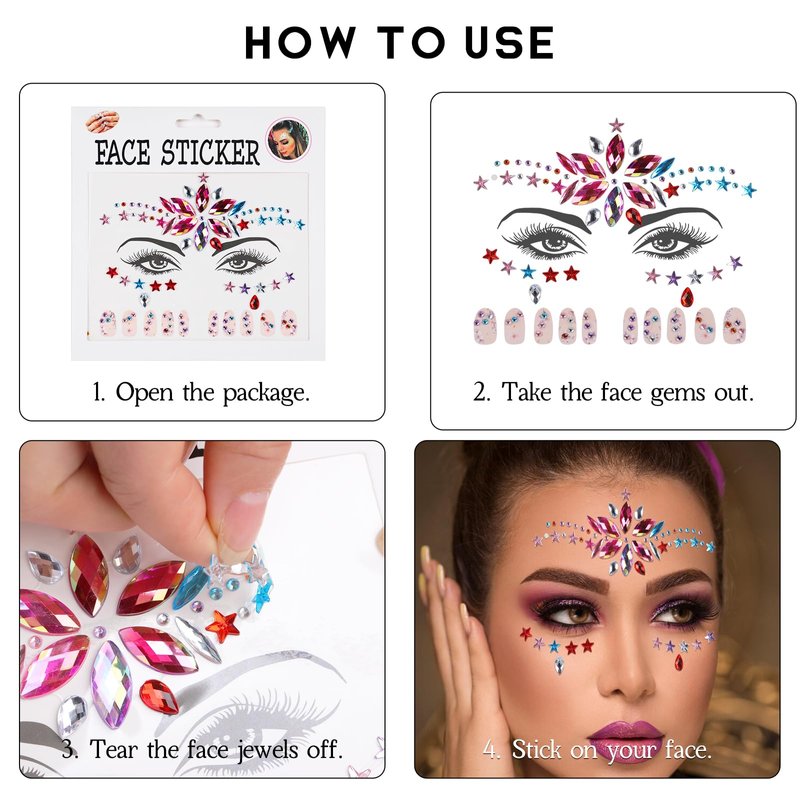 - Easy to Use: These festival face accessories come with built-in adhesive, making it a breeze to stick the face crystals. Simply prepare your skin, peel off from the backing, and apply according to your design. No extra glue required. They are easy to remove and leave no residue on your hair or skin.