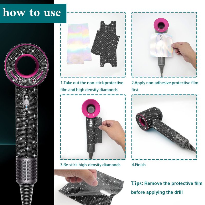 Shine! Shine! Shine! Our wrap sticker for the Dyson hair dryer is made of the best glass rhinestone, tidy high density, and mini size.