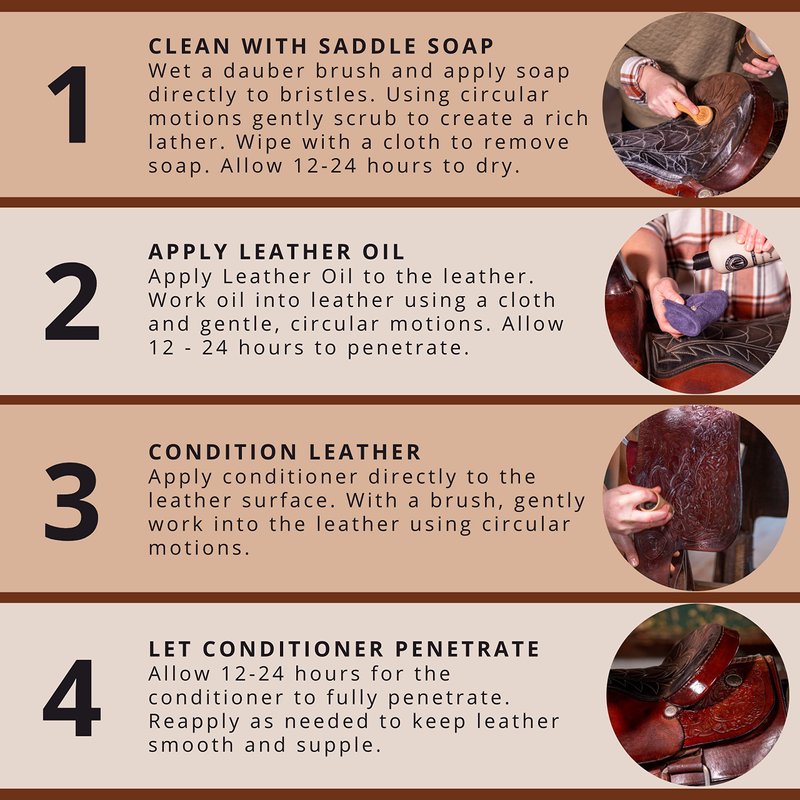 - Clean and Protect: Leather tack takes a beating from dirt, mud, rain and sweat. Clean with saddle soap, then apply oil and conditioner to hydrate and protect. Proper care extends the life of leather