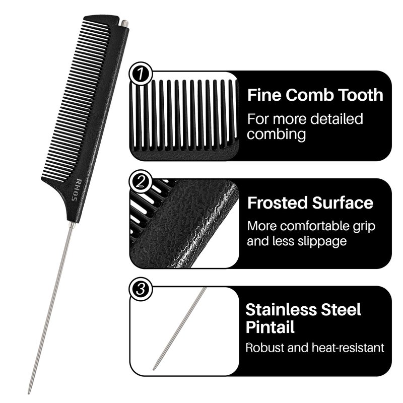 - 【Durable and Stable】RHOS Rat Tail Comb is made of carbon,which is not easily deformed or damaged and is more durable than ordinary combs.The pin tail is made of stainless steel,which is not only heat-resistant but also anti-static.
