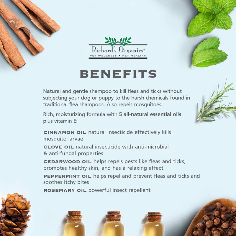 - NO HARSH CHEMICALS – Unlike traditional flea shampoos, Richard’s Organics gentle and safe Flea and Tick Shampoo uses 100% all-natural actives to kill fleas and ticks rather than harsh chemicals. Made with 5 pure essential oils, this dog shampoo smells great and soothes irritated skin while it works hard to rid your dog of fleas and ticks.