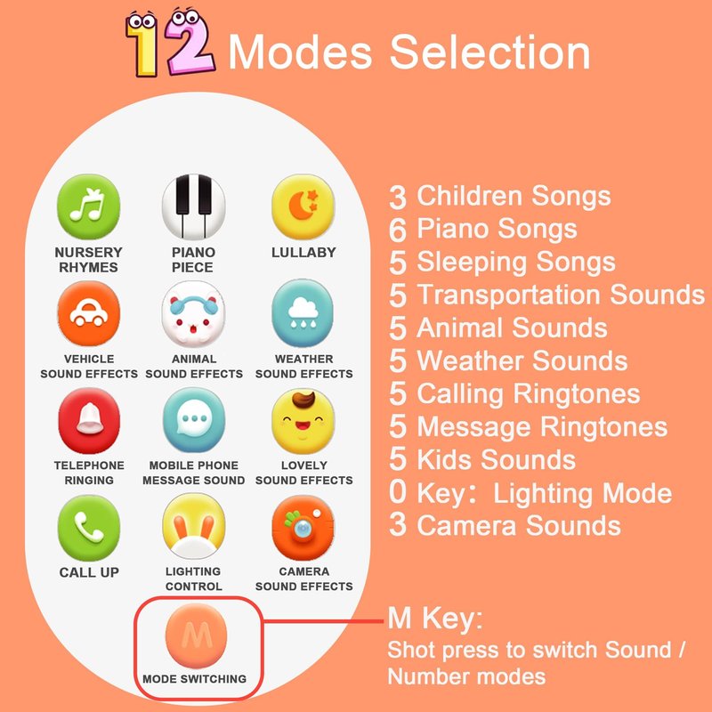 - Baby Toys Baby Girl Gifts: Richgv interactive baby phone features 12 learning modes, each button has multiple sounds and features,there are numbers 0 to 9, songs, lullaby and different sound effects like vehicles, thunder/rain/wind, animals, camera shutter and the realistic dial sound effects,phone/message ringtones just like mom and dad's phone! Leaving baby with lots of room to explore and use their imagination. Great for babies who like to take and play with real phones/remotes