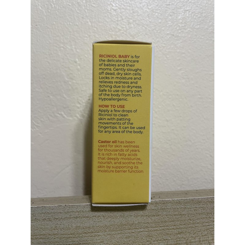 Riciniol Baby is a hypoallergenic high-purity universal castor oil bio-emulsion that does not contain any synthetic additives. It is designed for delicate skin care of babies, as well as pregnant women and nursing mothers. How to use Apply a few drops of bio-emulsion to clean skin with patting movements of the fingertips. It can be used for any area of the body. CASTOR OIL has been used for skin wellness for thousands of years. It is rich in fatty acids that deeply moisturize, nourish, and soothe the skin by supporting its moisture barrier function.