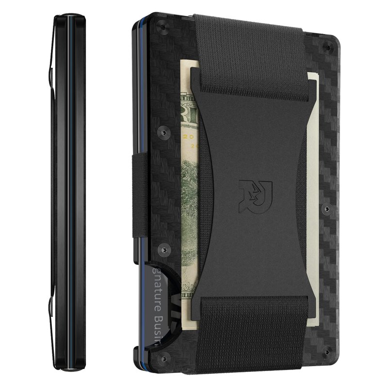 - SPECIFICATIONS – RFID-blocking materials - 6061-T6 aluminum | anodized carbon fiber plates - 1.5 oz | 86 x 54 x 6 mm frame - Interchangeable elastic and screws. This slim wallet is perfect for those looking for a card holder wallet or metal wallet that combines functionality and style