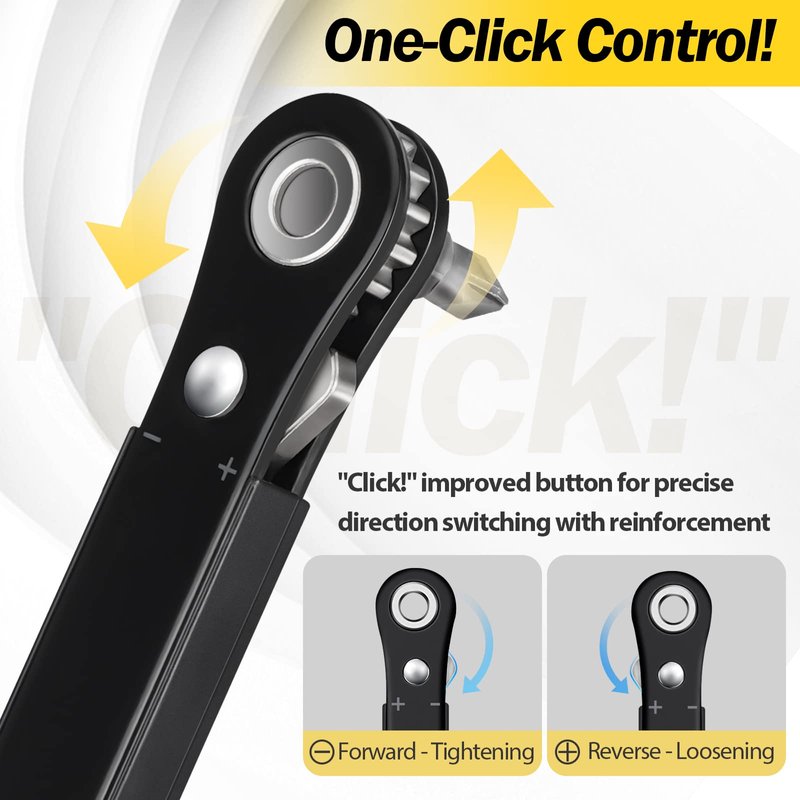 - Upgraded Force Control and Magnetic-like Clip - For smooth and efficient house repair work! The directional control button of this 90 degree screwdriver drill has been upgraded and optimized to provide a crisp "click" sound and facilitate precise control for flexible tightening and loosening screws with ease of use. Ratcheting screwdriver with magnetic-like clip tightly secures bit for faster work. Boost efficiency and speed up your work with DOMETOUR mini ratchet set!