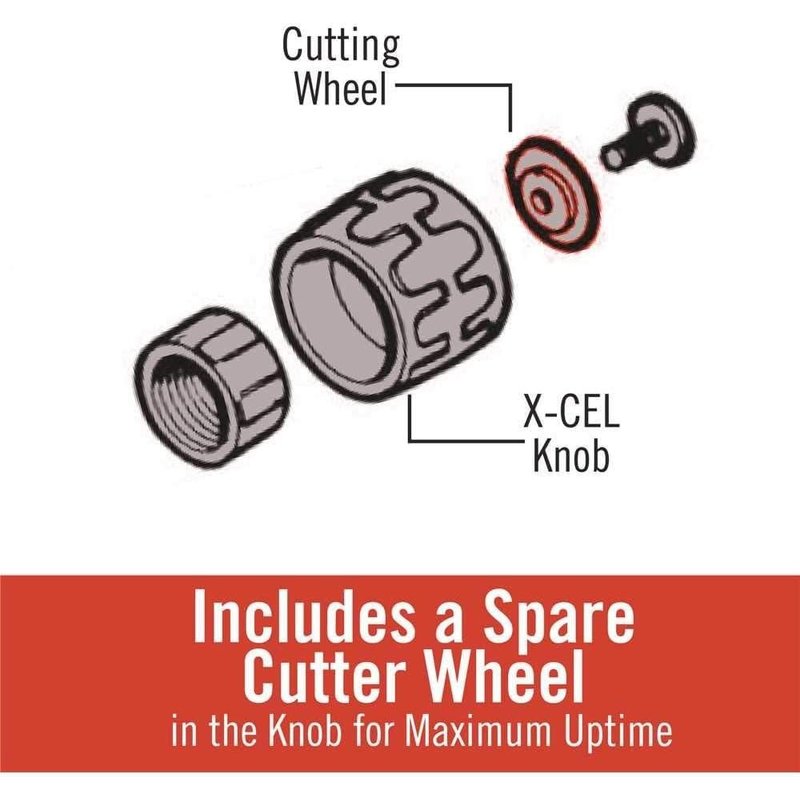- Innovative X-CEL ball detent wheel pin allows quick, tool-free cutter wheel changes in seconds, with no lost clips