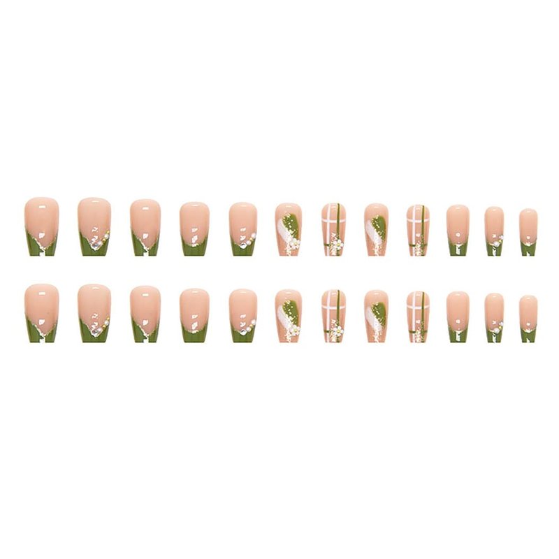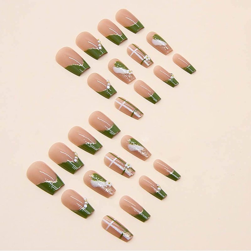 RikView French Tips Nails Medium Press on Nails Coffin Fake Nails Green Nails Glossy Full Cover Nails 24 PCS/Set