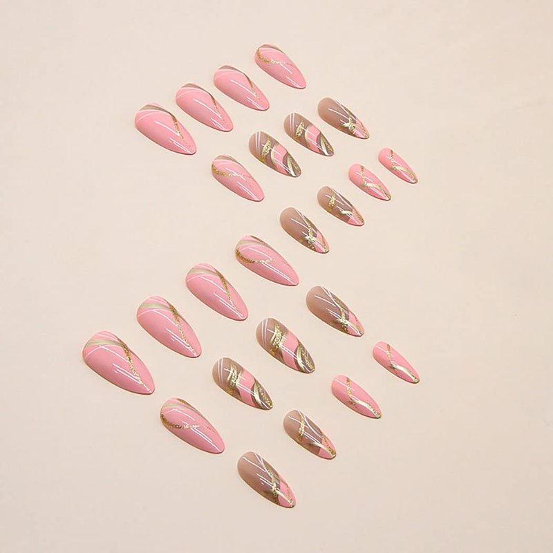 RikView Pink Press on Nails Medium Fake Nails with Swirls Design Almond Acrylic Nails Glossy Full Cover Nails