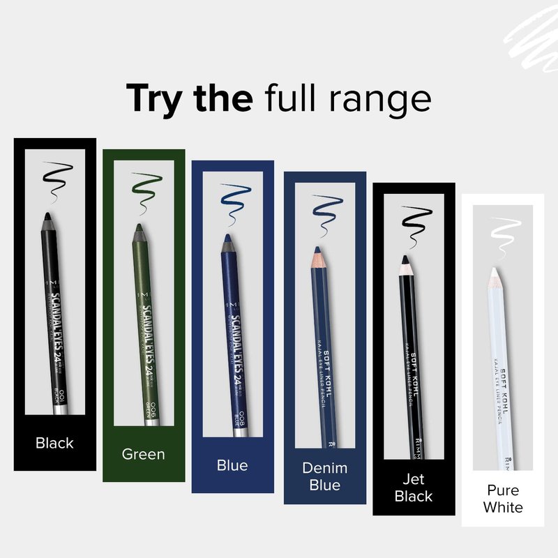 - Rimmel Soft Kohl Kajal Eye Pencil gives dense colour application, which can be blended into the lid for a softly smudged look. The formula is soft, rich and easy to apply with a traditional pencil to create bolder, thicker lines for the ultimate eye definition that lasts all day.