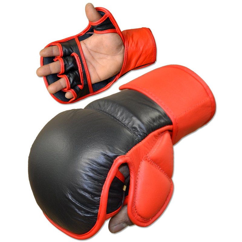 Ideal for MMA training.Open palms.Weighs 6 oz.Thick 2 inches of advanced protective padding over the knuckles.Extra wide velcro wrist strap for extra support.Dual cross directional strap system for ultimate wrist support and striking performance one strap is elasticated which is coverd by seconed leather strap after. Made of genuine leather