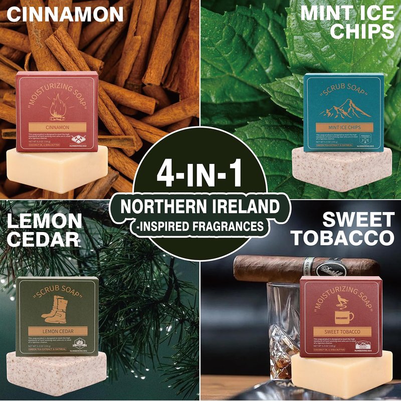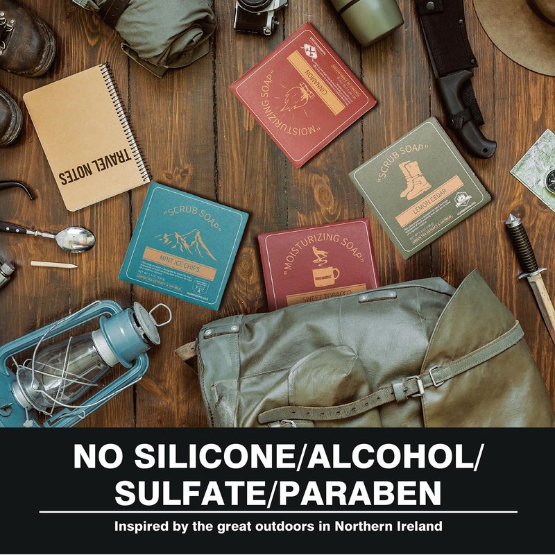- 4-NI-1 UNIQUE DESIGN: Our Soaps are inspired by the great outdoors in NI (Northern Ireland). The unique and manly fragrances evoke adventures from the wilderness.Designed for hardworking men who demand a vigorous cleanse. Really nice bar soap set gift