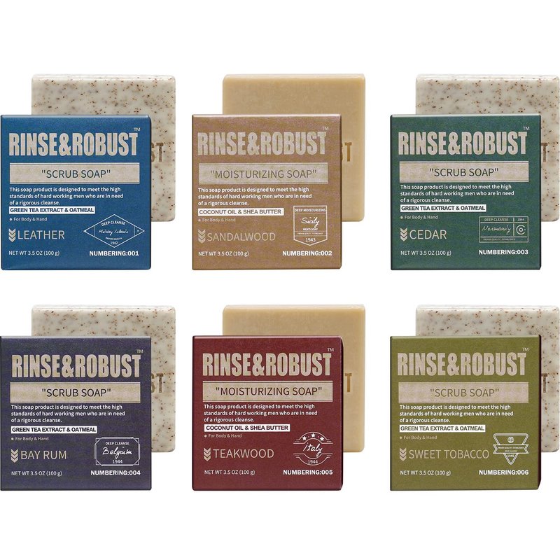 - UNIQUE FRAGRANCES DESIGN: Rinse&Robust Soaps are infused with uniquely masculine fragrances. Indulge in the captivating scents of Leather, Sandalwood, Cedar, Bay Rum, Teak Wood, and Sweet Tobacco. Each fragrance not only leaves your skin feeling relaxed but also invokes the essence of our natural surroundings.