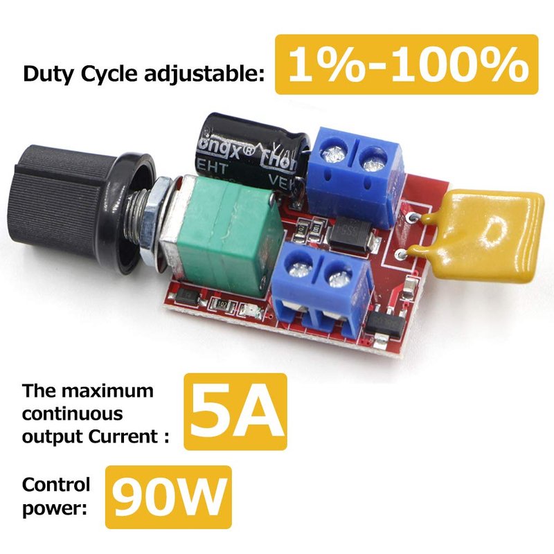 - Speed Control Switch Low Voltage DC 3V 5V 6V 12V 5A;Control Power: 90W;Duty Cycle adjustable: 1%-100%
