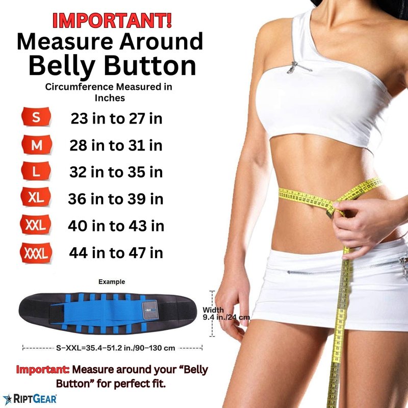 - Perfect Fit - RiptGear back braces come in 6 different sizes including Small, Medium, Large, XL, 2XL, 3XL, and are available in two colors - Blue or Black. For a perfect fit measure the circumference around your navel (belly button) to back. Do not use your waist size as the back brace will be too small. Review the measuring guide in the listing or pictures before ordering your back support brace