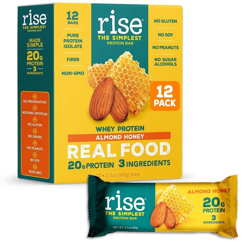 Rise Whey Protein Bars - Almond Honey | Healthy Breakfast Bar & Protein Snacks, 20g Protein, 4g Fiber, Just 3 Whole Food Ingredients, Non-GMO Healthy Snacks, Gluten-Free, Soy Free Bar, 12 Pack