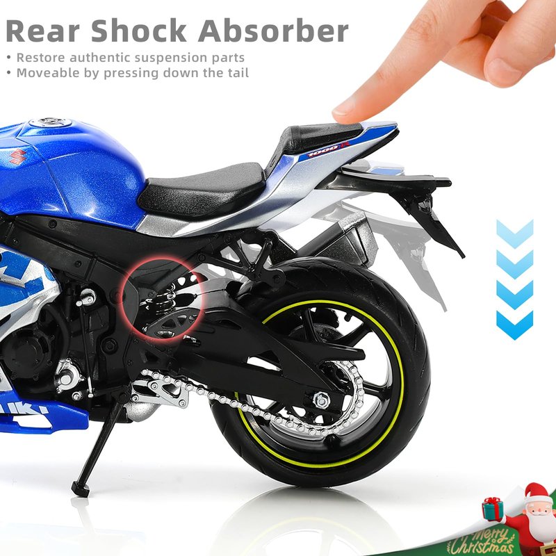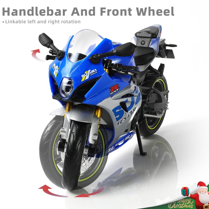 - 【Material & Highlight】-The main body of the SUZUK GSX R1000R motorcycle model is made of alloy diecast motorcycle model materials and high-quality plastics,the tire part is made of rubber.The intricate details such as rotatable support pedals, twistable front wheels also enrich the motorcycle's realism and appeal. This design not only ensures the excellent durability of the motorcycle model toy 1/12, but also enhances the overall authenticity and collection value of the 1/12 motor model toy.