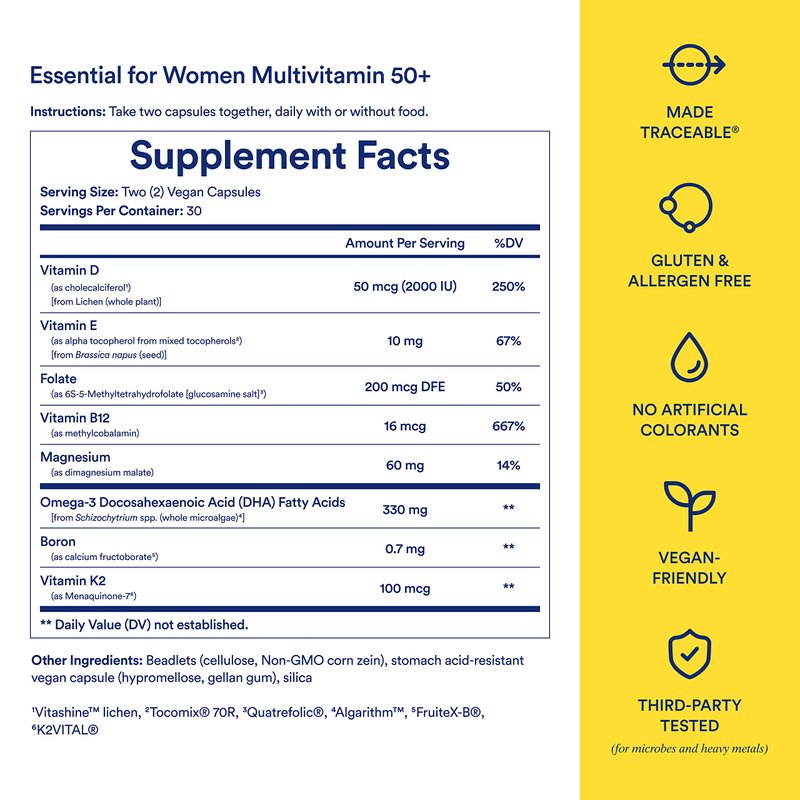 - Essential for Women Multivitamin 50+ is the multivitamin reimagined for women post-menopause with 8 key nutrients to support healthy aging from within. Our formula is vegan, sugar-free, gluten-free, dairy-free, nut-free, soy-free, and formulated without stevia, sugar alcohols, and artificial colors, flavors, or sweeteners. Each serving provides 330mg of Omega-3 DHA.*