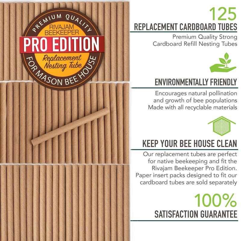 Rivajam 125 Mason Bee House Cardboard Nest Tubes Refill Pack | Solitary Bee Hive & Mason Bee Supplies | Mason Bee Starter Kit & Bee Habitat Garden Gift | Bee Hotels Tubes & Bee Nest Box Inserts Liners