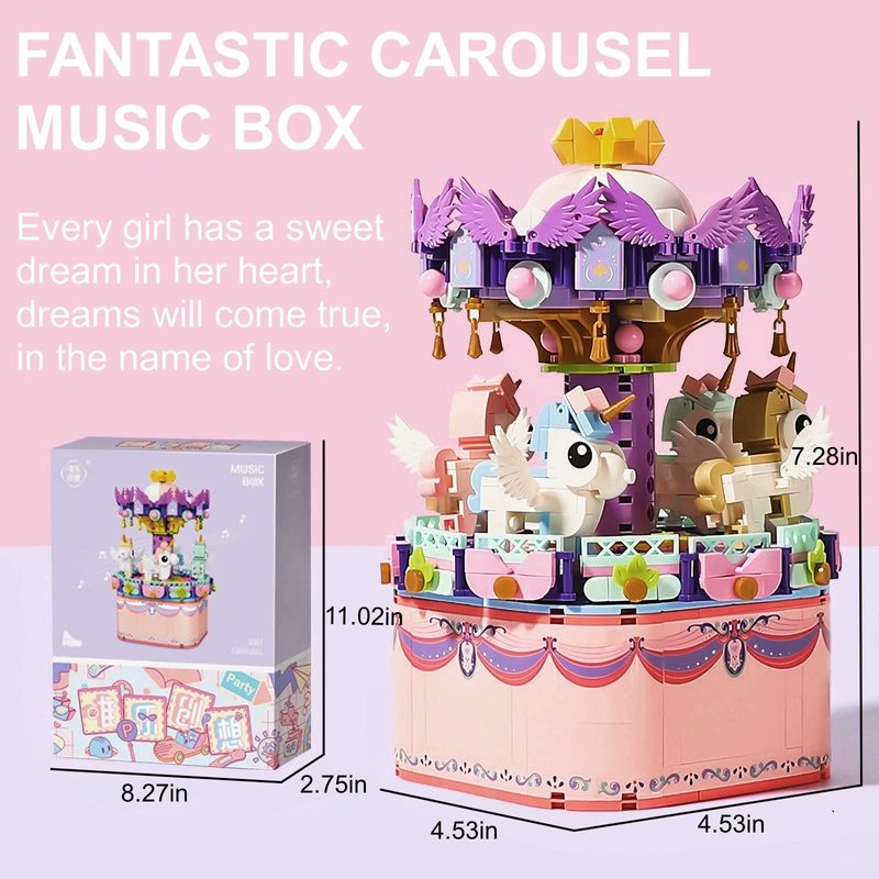 - [What Do You Get]- The Street View Carousel Music Box Bricks Model Set is an amazing DIY building block set that comes with 874 pieces, Its size is 7.28x4.53x4.53in.