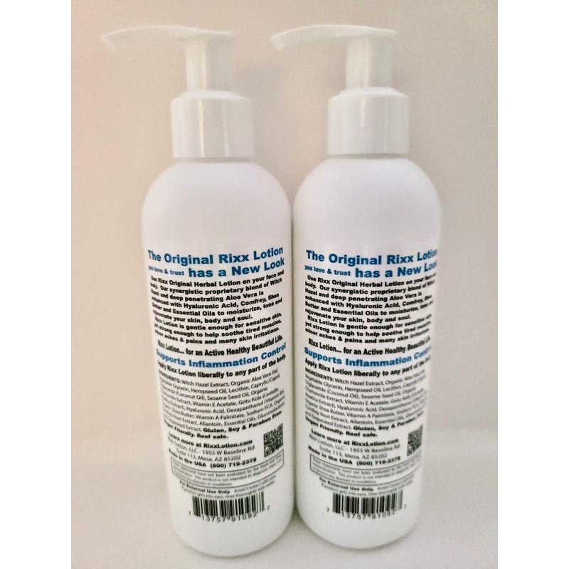 Rixx Lotion Original is made with Witch Hazel, Aloe Vera, Shea Butter, Hyaluronic Acid and Essential Oils. Rixx Lotion offers a unique combination of natural ingredients and is a deep penetrating moisturizer and skin toner in one. Rixx is an amazing body and face lotion for all ages.