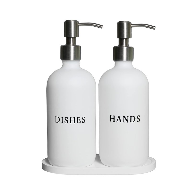 - REDUCE CLUTTER: Save space and reduce clutter with our dish soap and hand soap dispenser for kitchen sink. Our space-saving design includes a tray that keeps the set tidy on your countertop, and the matte glass bottles and stainless steel pumps put your dishwashing liquid and hand soap at your fingertips with style. The RM Home dispenser set is a fantastic solution for anyone who wants a gorgeous, clean, and spotless kitchen.