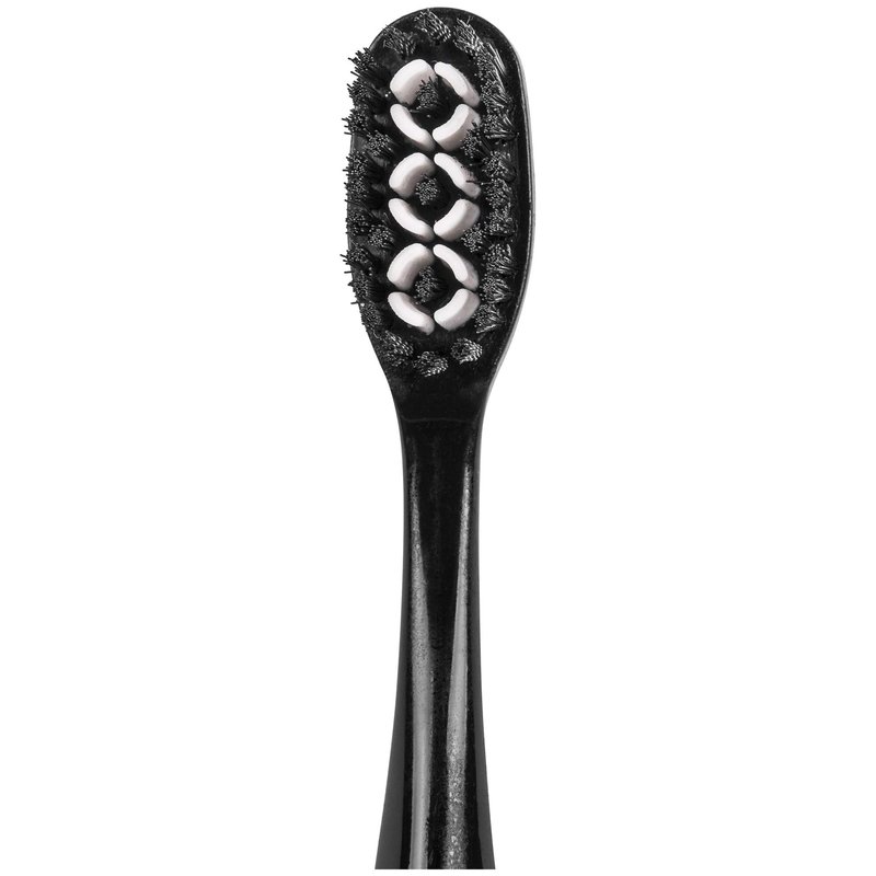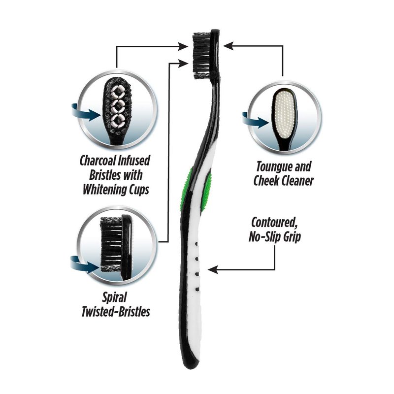 - Charcoal infused bristles whiten teeth, whitening cups polish away stains, and spiral bristles at both tips have been added for extra whitening Power!
