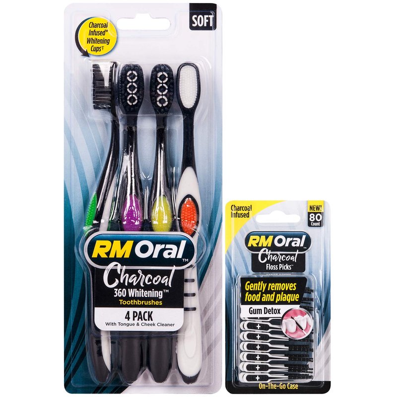 RM Oral Charcoal Whitening Soft Brushes 4ct with 80 Count Charcoal Floss Picks