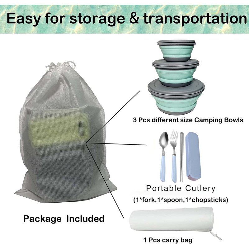- 【What You Get 】A set of 3 collapsible silicone camp bowl with lid, 1 Pcs carry bag and a set of 3 Pcs foldable tableware(1*fork,1*spoon,1*chopsticks).Ideal for preparing or storing food.