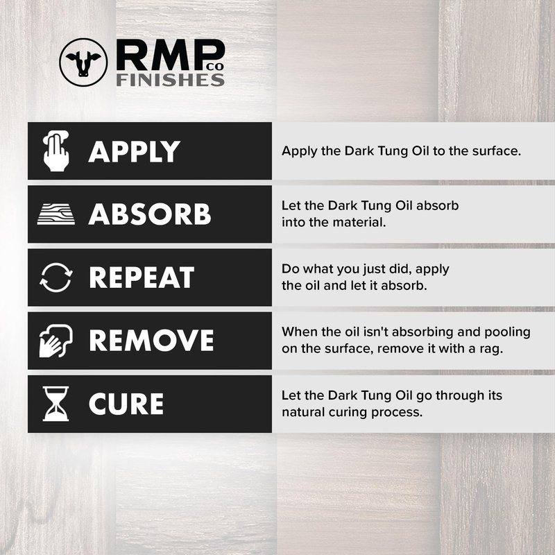 RMP Finishes Dark Tung Oil Tung Oil is native to China and extracted from the seeds of the tung tree. Tung Oil is fast drying and provides a matte protective finish for a variety of wood surfaces. Our Dark Tung Oil has an added natural resin which forms the dark matter color that’s ideal for achieving an aged look. The oil penetrates into the wood grain and provides an optimal color finish due to its freshness. It’s ASTM Quality Tested and fresh pumped daily. This natural oil wood sealer is ideal for creating an antique style finish on furniture. Because of the thick viscosity of Dark Tung Oil, we recommend thinning it with Citrus Solvent or Odorless Mineral Spirits. Waterproof and Color Stable Dark Tung Oil is color stable and does not darken over time like other oils such as linseed. It does not blister, or go rancid. Dark Tung Oil forms a protective barrier and natural waterproof finish which resists abrasion. Planet Friendly A natural way to finish wood surfaces. Dark Tung Oil contains no VOCs, heavy metals, or additives. It is safe for food contact and ideal to use as a food grade cutting board oil. Versatile Dark Tung Oil is ideal for wood staining, home DIY projects, or use by carpenters and woodworkers. Use on wood, concrete, stone, brick, and about any porous surface. Dark Tung Oil is ideal for use on wood floors, decking, cabinets, wood cutting boards, wood countertops, outdoor furniture, and siding. Coverage Sample covers 1 sq. foot 8 oz. covers 25 sq. feet 16 oz. covers 50 sq. feet 32 oz. covers 100 sq. feet Gallon covers 400 sq. feet