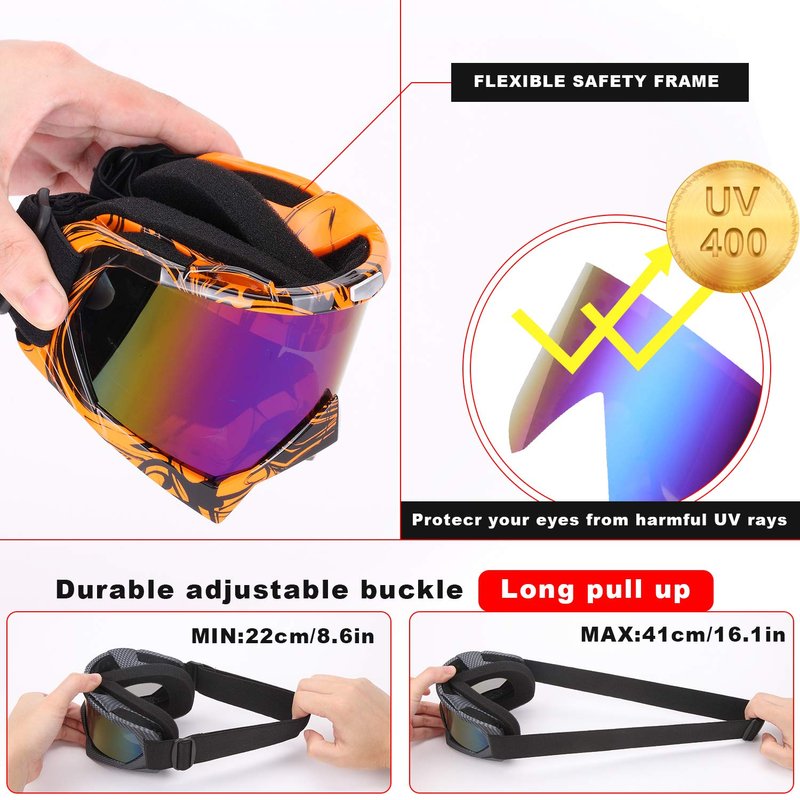 - PERFECT UV 400 PROTECTION: Powerful lens provides 100% UV 400 protection, anti-glare function and wide view angle. The balanced light transmittance makes it suitable for various sports, like skiing, skating, climbing motorcycling, cycling, skydiving, bungee jumping, playing shooting games and snowball fights.