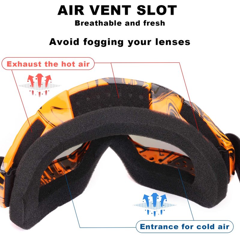 - PERFECT INNER AIR CYCLE & GLASSES COMPATIBILITY: Great air cycle formed by the air vents on the top and the bottom of the frame emits heat and reduces fog on the lens effectively. Also, wide lens and frame allow you to use them with your glasses wearing on.