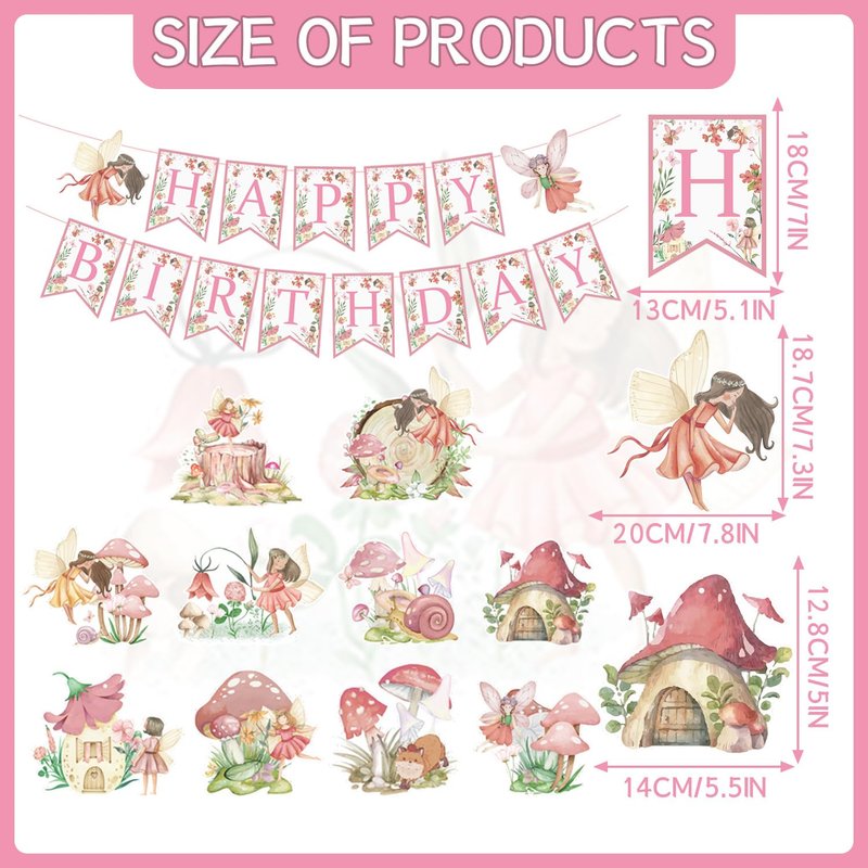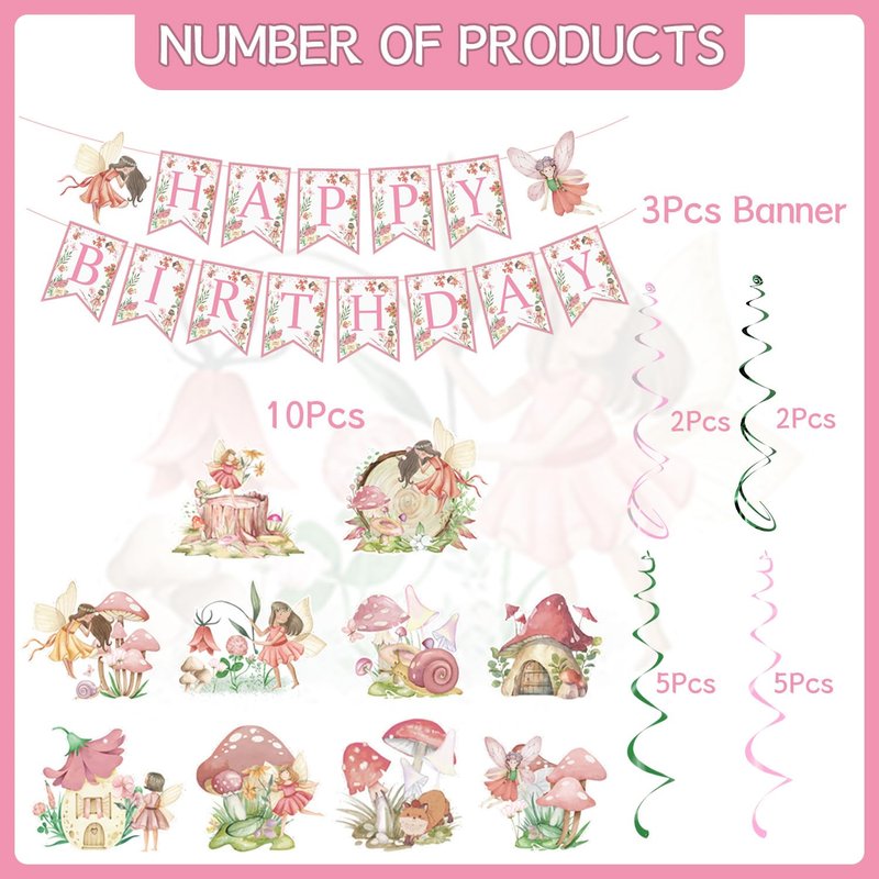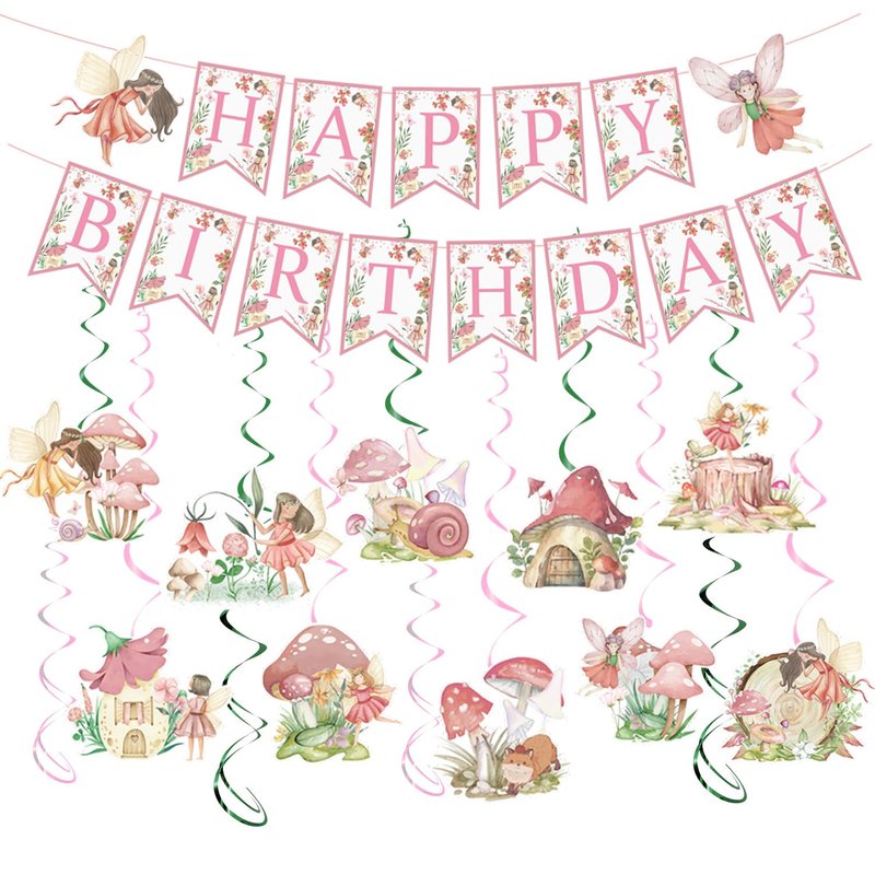 - Fairy Birthday Decorations: Fairy-themed birthday decorations, and birthday party decorations specially designed for girls. Combine flowers, fairies, mushrooms, "HAPPY BIRTHDAY", mushroom houses, and other fairy tale elements to create a unique fairy and elf-themed birthday party.