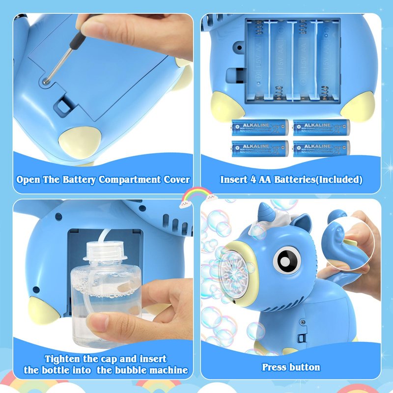 - 【Safety For Kids】- Unicorn bubble machine is made of non-toxic ABS material, BPA free that exquisite craftsmanship makes the surface smooth and burr-free, protecting children's hands from scratches. The bubble liquid is made of non-toxic soap solution, Which is gentle and safe for human skin contact without irritation. Our bubble gun machine have passed the U.S. toy ASTM safety test, You can buy with confidence.