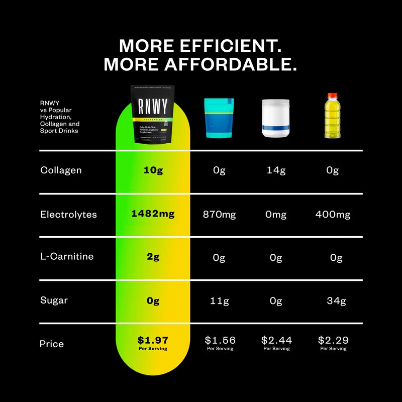 Simplify your routine and support your active and athletic lifestyle with RNWY Foundation, a cutting-edge blend of targeted ingredients carefully formulated to energize, optimize, and prolong your your ability to do what you love. Featuring clinically-proven BioActive Collagen Peptides, Tendoforte, and Fortigel for targeted joint support, supporting your tendons, ligaments and cartilage. This, along with L-Carnitine and a B-Vitamin complex helps fuel your endeavors with foundational energy and supports your recovery. This supplement is also an excelent source of key vitamins and minerals, supporting electrolyte balance and hydration for exercise. This powerful blend of ingredients is designed to support runners of all types by providing you foundational energy, reinforcing joint health, accelerating recovery, and fostering overall well-being, enabling you to keep running strong for years to come. Make this product an essential part of your daily routine and Fuel Your Journey!