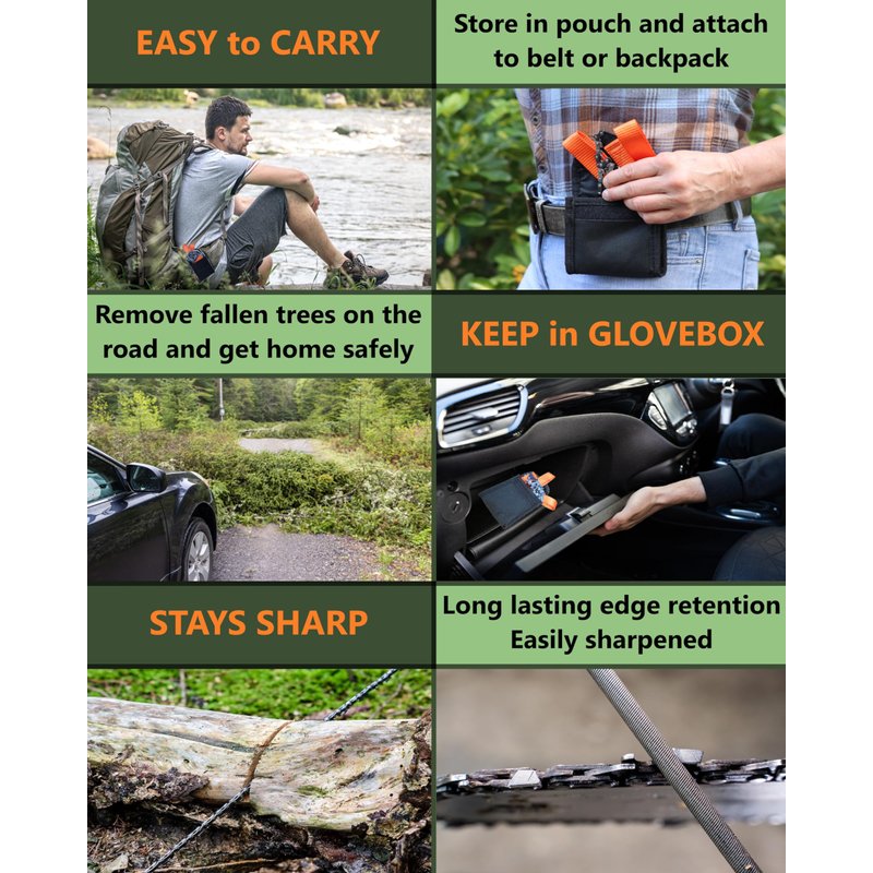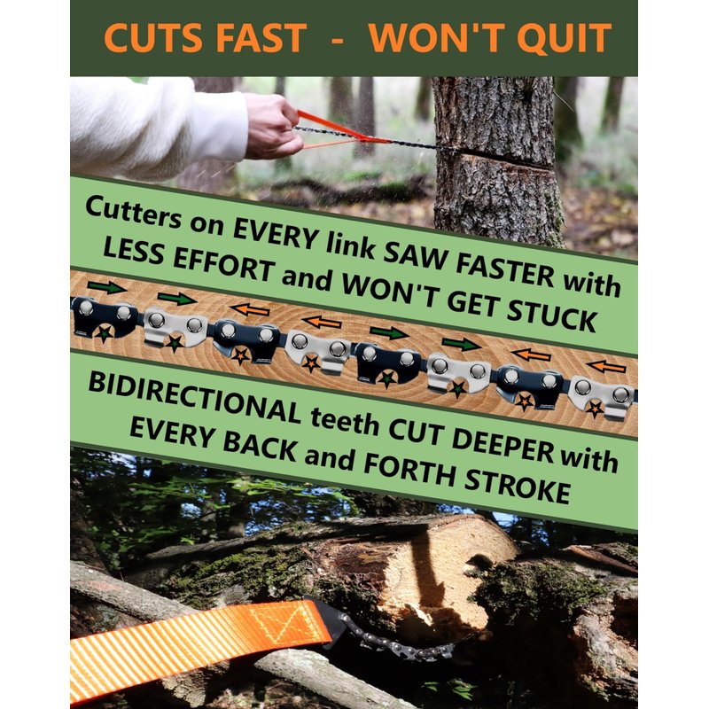 - BI-DIRECTIONAL TEETH REDUCE BINDING: this portable, manual chainsaw is like having Paul Bunyan in your pocket. The 48 saw teeth are made from strong heat-treated steel and cut both ways into the wood with less binding or sticking for fast and easy non-slip tree cutting. So you can cut deeper and faster, for longer than any other tactical camping survival gear and supplies. The teeth stay sharp easily with a ⅜ P Chainsaw file.