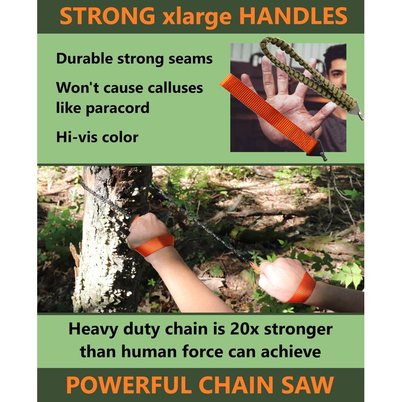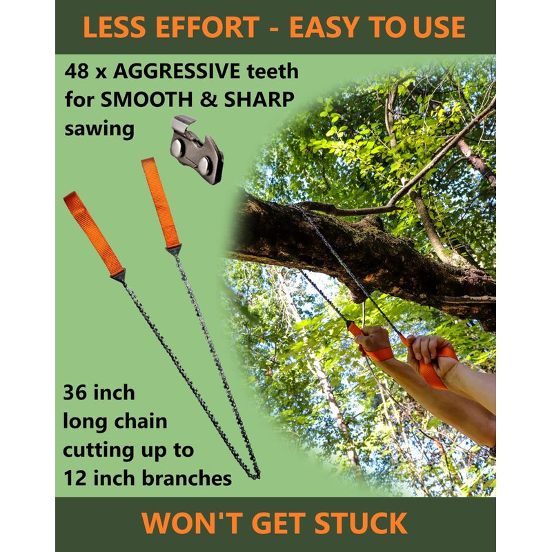 - 36 INCH CHAIN ROPE CUTS OVERHEAD BRANCHES EASILY: this rope chainsaw is 36 inches, making it easy to swing over high branches for cutting or pruning and fit into tight grooves where chainsaws can’t. The extra length creates a safe distance and easier cutting for one or two people.